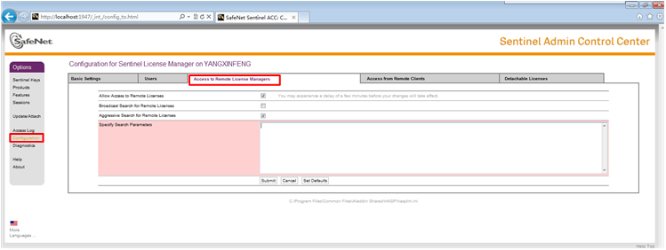 (3)在頁面左側選擇“Configuration”項,切換至“Access to Remote License Managers”選項卡,在“Specify Search Parameters”項輸入主機IP地址,如下圖所示。輸入完成后點擊“submit”進行提交。