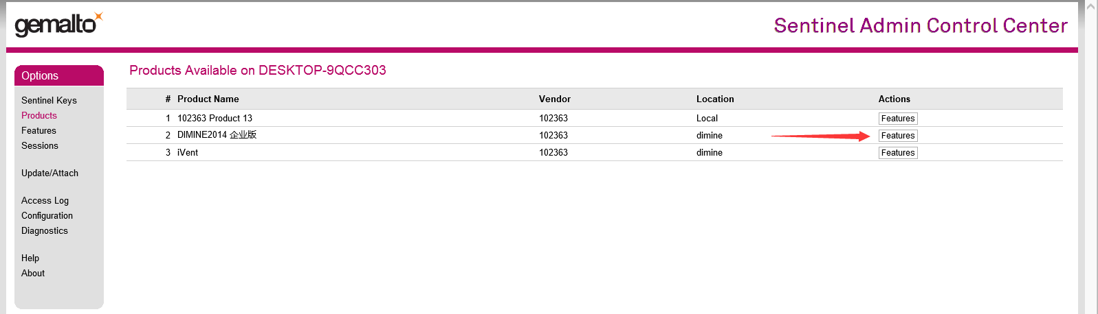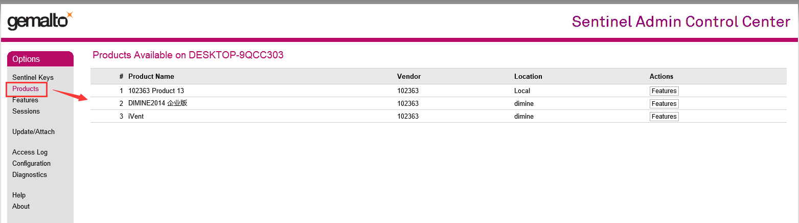 4、點擊相應產品后面的features,查看對應加密鎖有效期